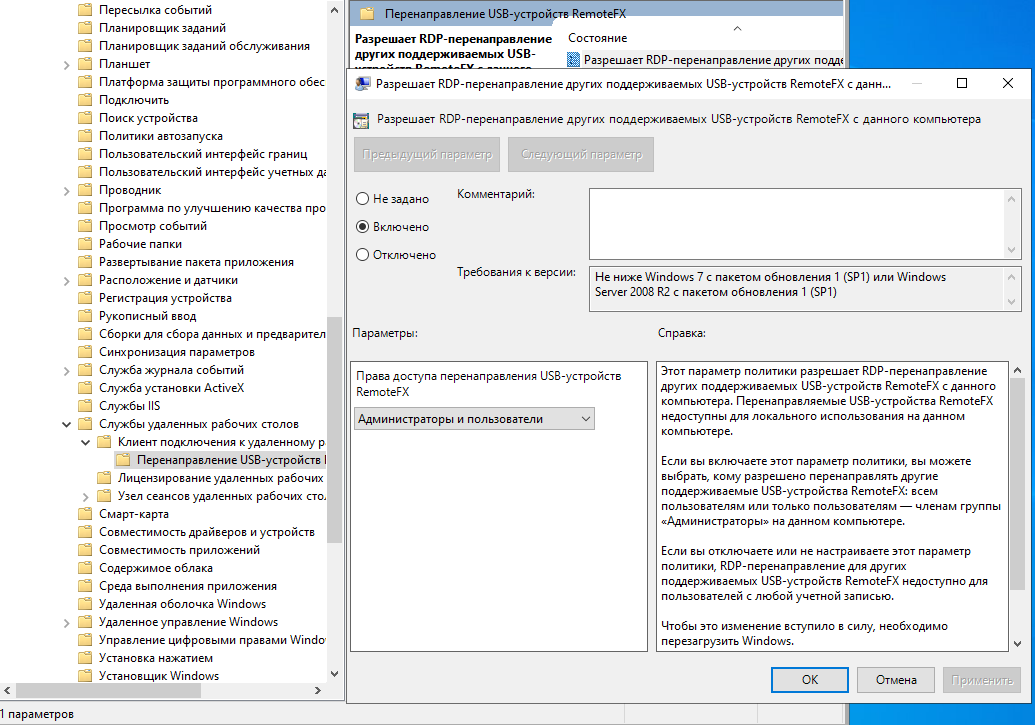 В открывшемся окне перейти по пути Конфигурация компьютера - Административные шаблоны - Компоненты Windows - Службы удаленных рабочих столов - Клиент подключения к удаленному рабочему столу - Перенаправление USB-устройств RemoteFX.