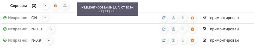 для размонтирования ФС на узлах, на которых подключен данный LUN. После выполнения операции размонтирования статусы напротив серверов изменятся на не примонтирован.