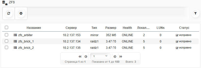 Перейти в раздел основного меню Хранилища - ZFS и проверить правильность создания zfs-бриков.