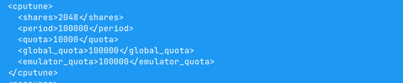 Для такого же теста. Если vcpu_quota в 10 раз меньше vcpu_period, то планировщик отдает в 10 раз меньше времени этой ВМ.