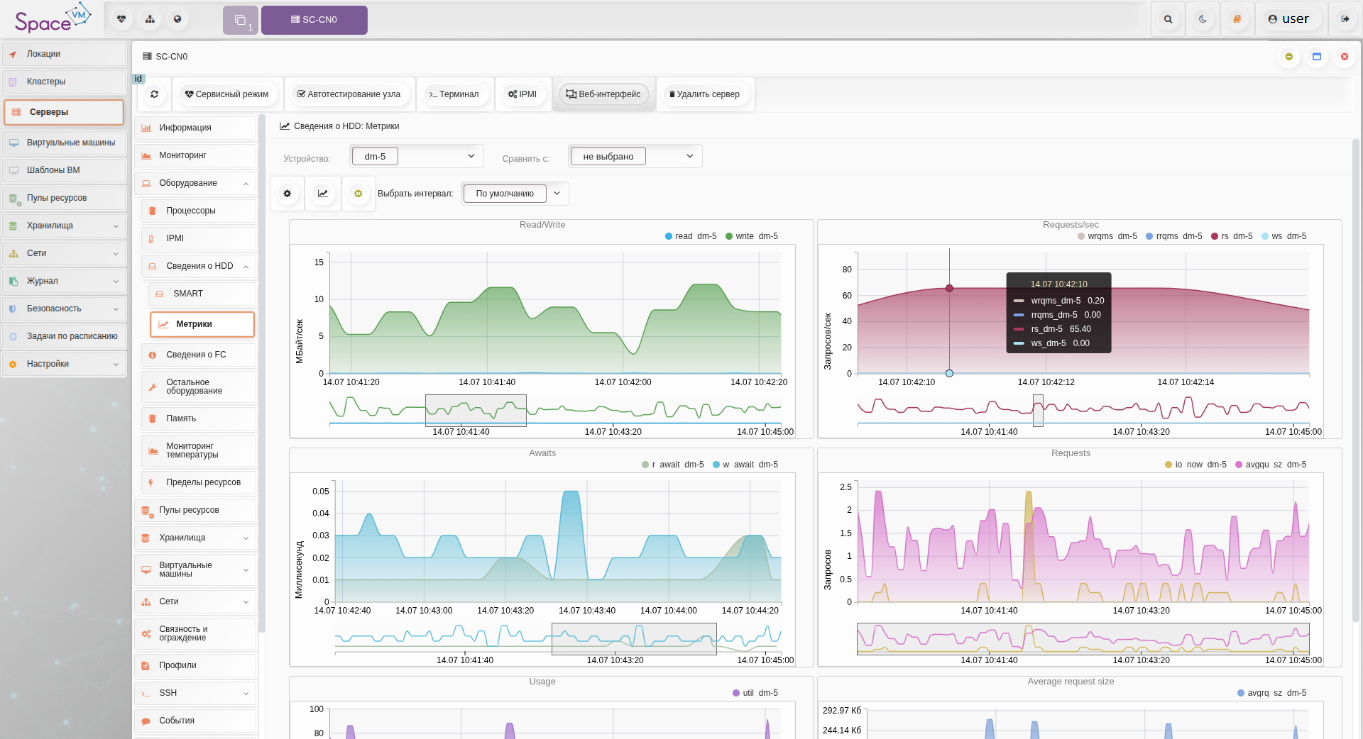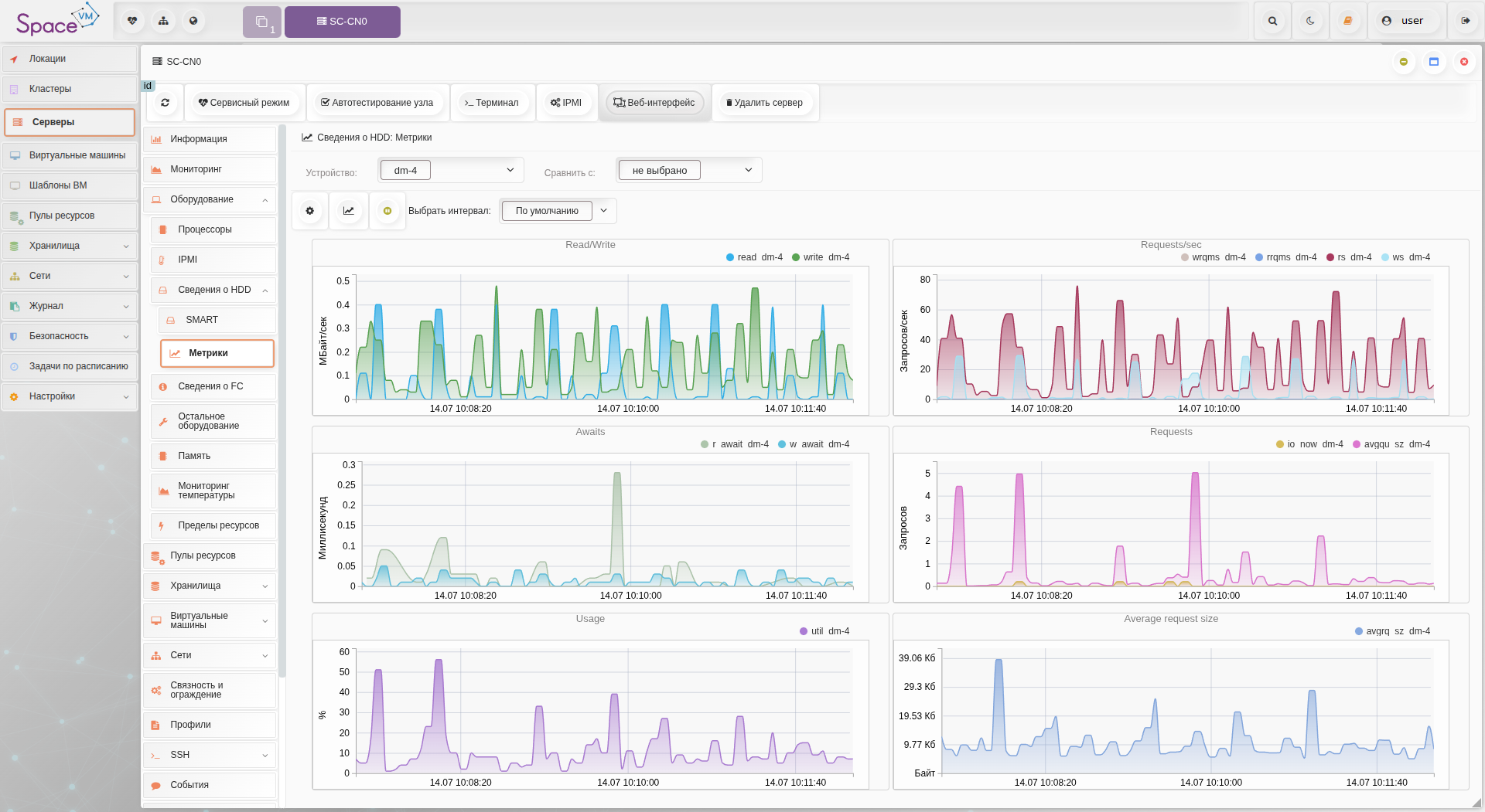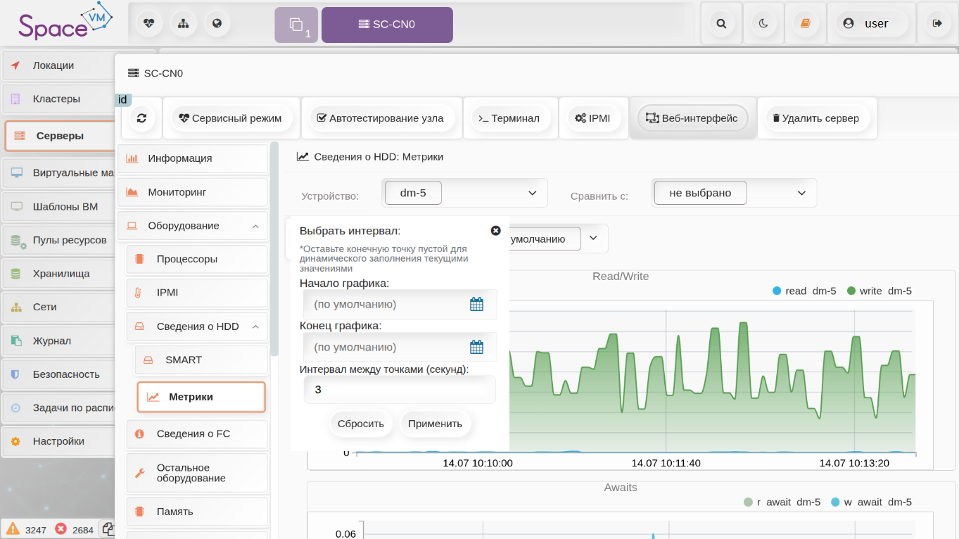 Для серверов в составе кластера доступны функции мониторинга HDD, позволяющие просматривать различные параметры как в реальном времени, так и за выбранный период. Чтобы просмотреть информацию о хранилище сервера, необходимо перейти в раздел Серверы – <Имя сервера> – Оборудование – Сведения о HDD – Метрики.