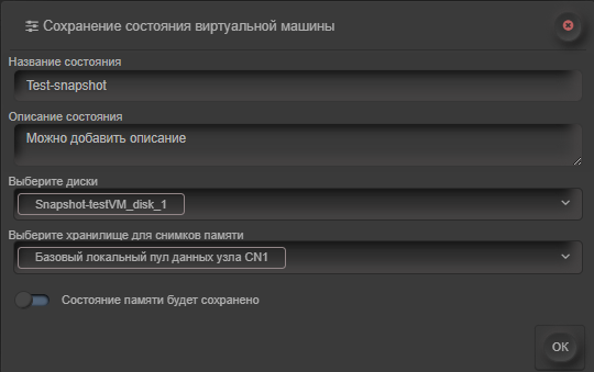 После указания параметров необходимо подтвердить операцию нажатием кнопки ОК. Система начнет процесс сохранения текущего состояния ВМ в соответствии с указанными параметрами.