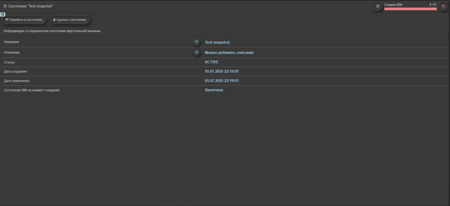 Снимки позволяют сохранить текущее состояние ВМ и при необходимости выполнить возврат к нему без необходимости полной переустановки ОС ВМ. Снимки полезны, к примеру, при ошибках в работе ВМ, неудачных обновлениях ОС ВМ или для безопасного тестирования новых конфигураций и ПО.