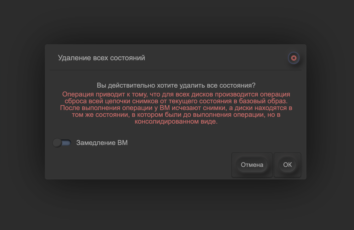 Операция удаляет все сущности снимков ВМ, оставляя диски в неконсолидированном состоянии (в файловой системе диск представлен несколькими файлами). Это позволяет получить контроль над дисками, снимая ограничения, связанные с наличием снимков. Однако без консолидации дисков ВМ не сможет включиться или создать новый снимок. Консолидацию можно выполнить в меню диска. Для сброса состояний необходимо нажать кнопку Сброс состояний в меню снимков.